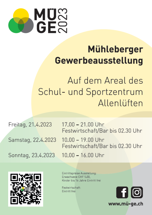 Die Mühleberger Gewerbeausstellung auf dem Areal des Schul- und Sportzentrum Allenlüften findet vom Freitag, 21. April bis Sonntag, 23. April 2023 statt.